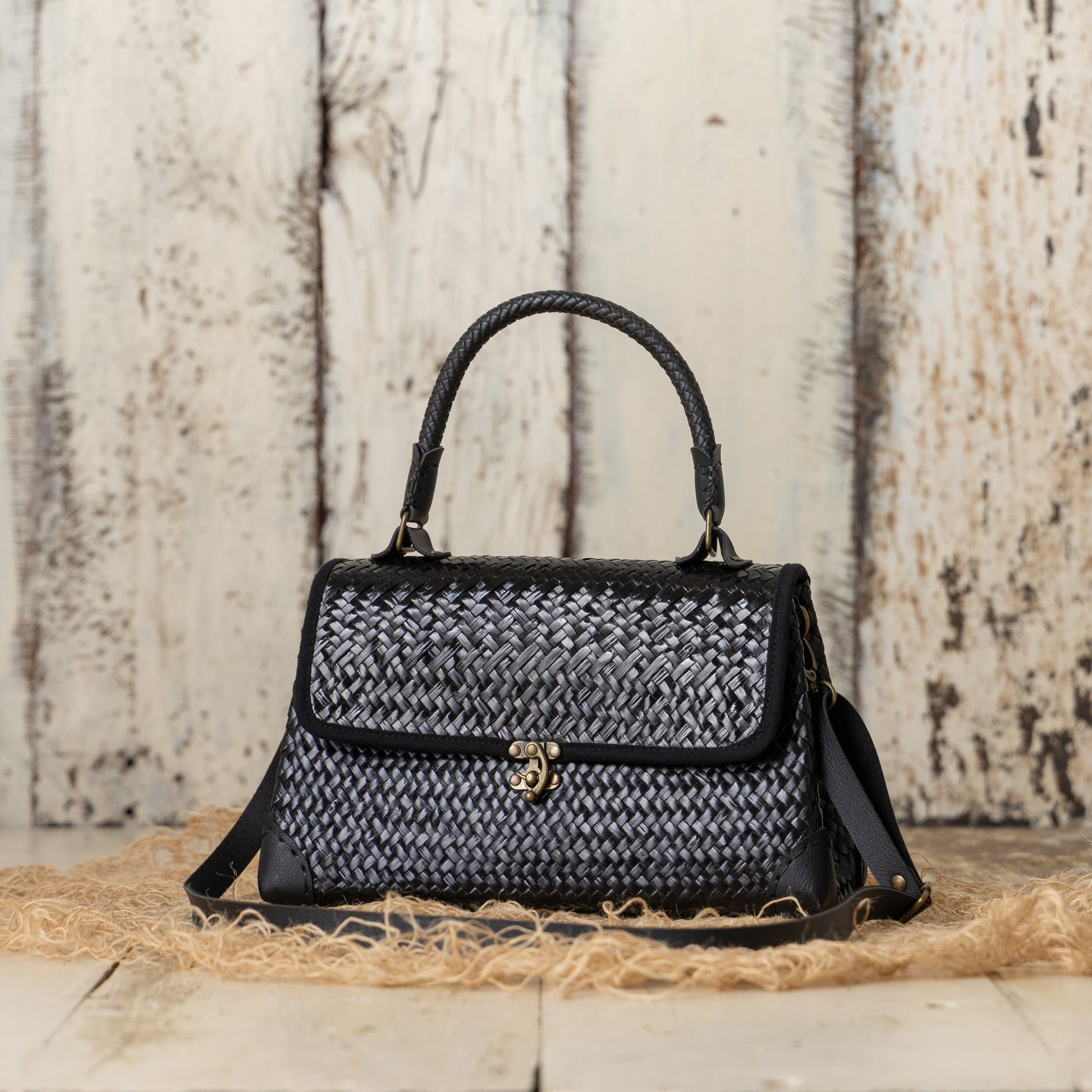 This handwoven bag features a naturally textured grass body, carefully dyed in deep black.