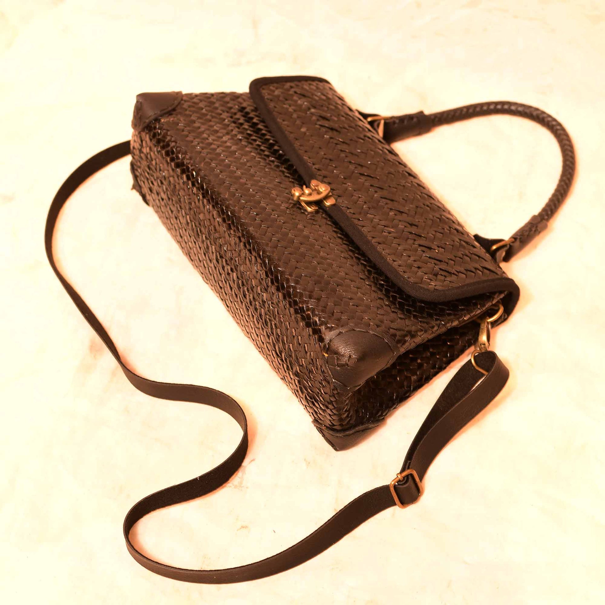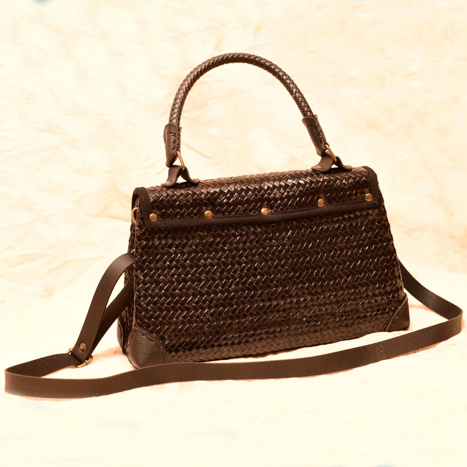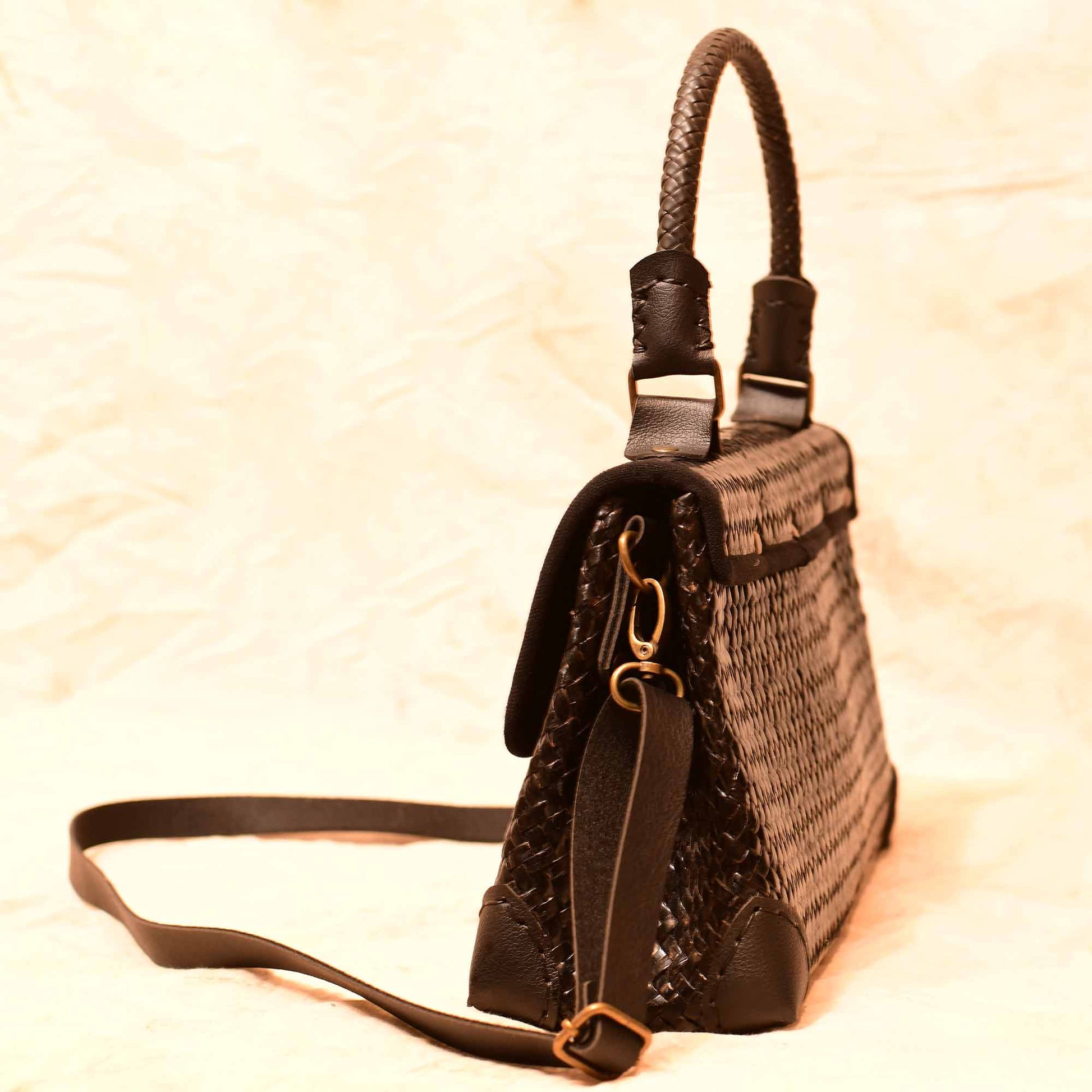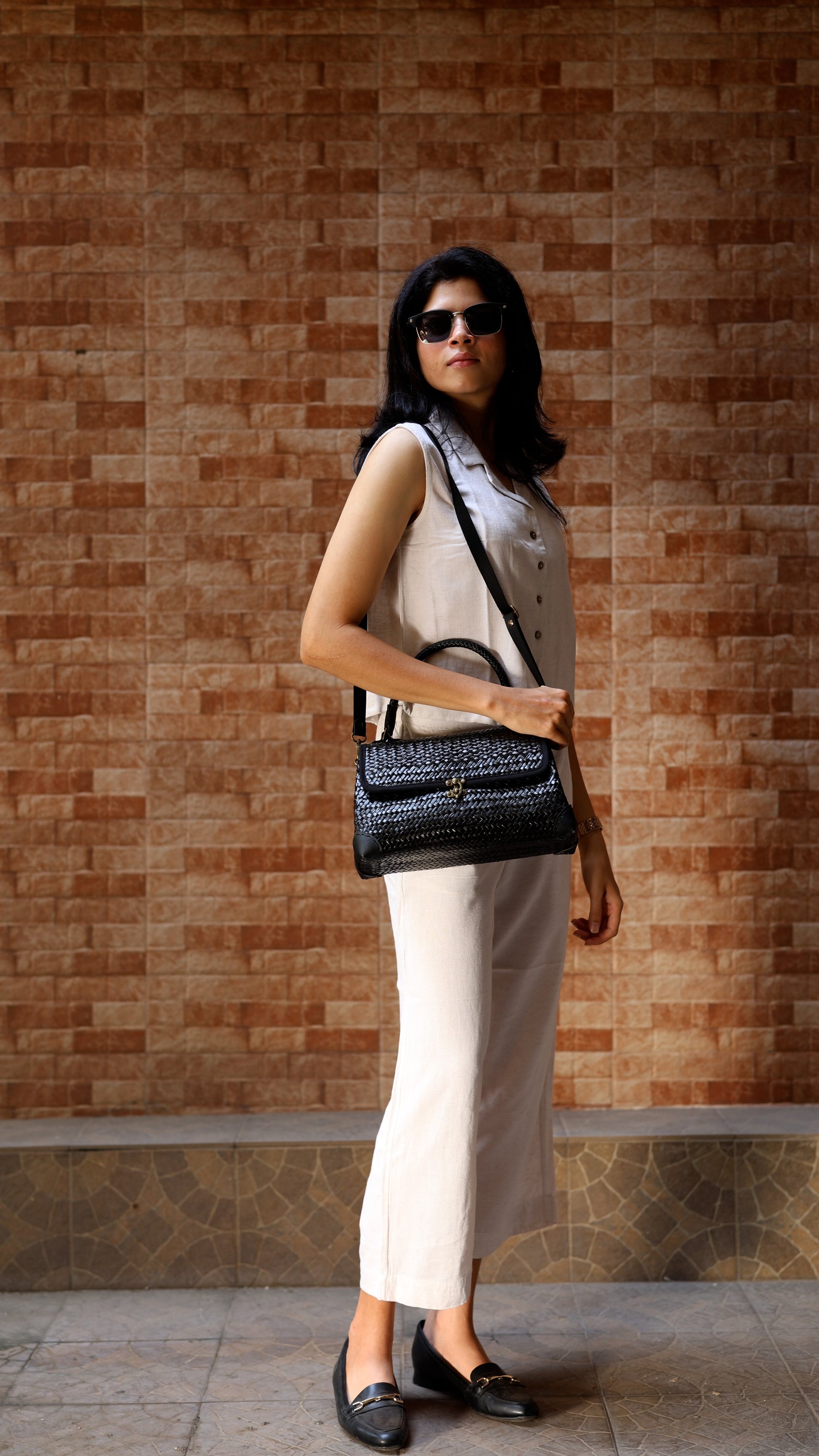 Its sleek body is elevated by a braided faux leather handle—soft to the touch, strong in presence. Designed for the modern muse, blending earthy texture with a refined urban edge. Whether carried to a gallery stroll or a moonlit dinner, this piece is light in weight and pairs craftsmanship with cosmopolitan charm.