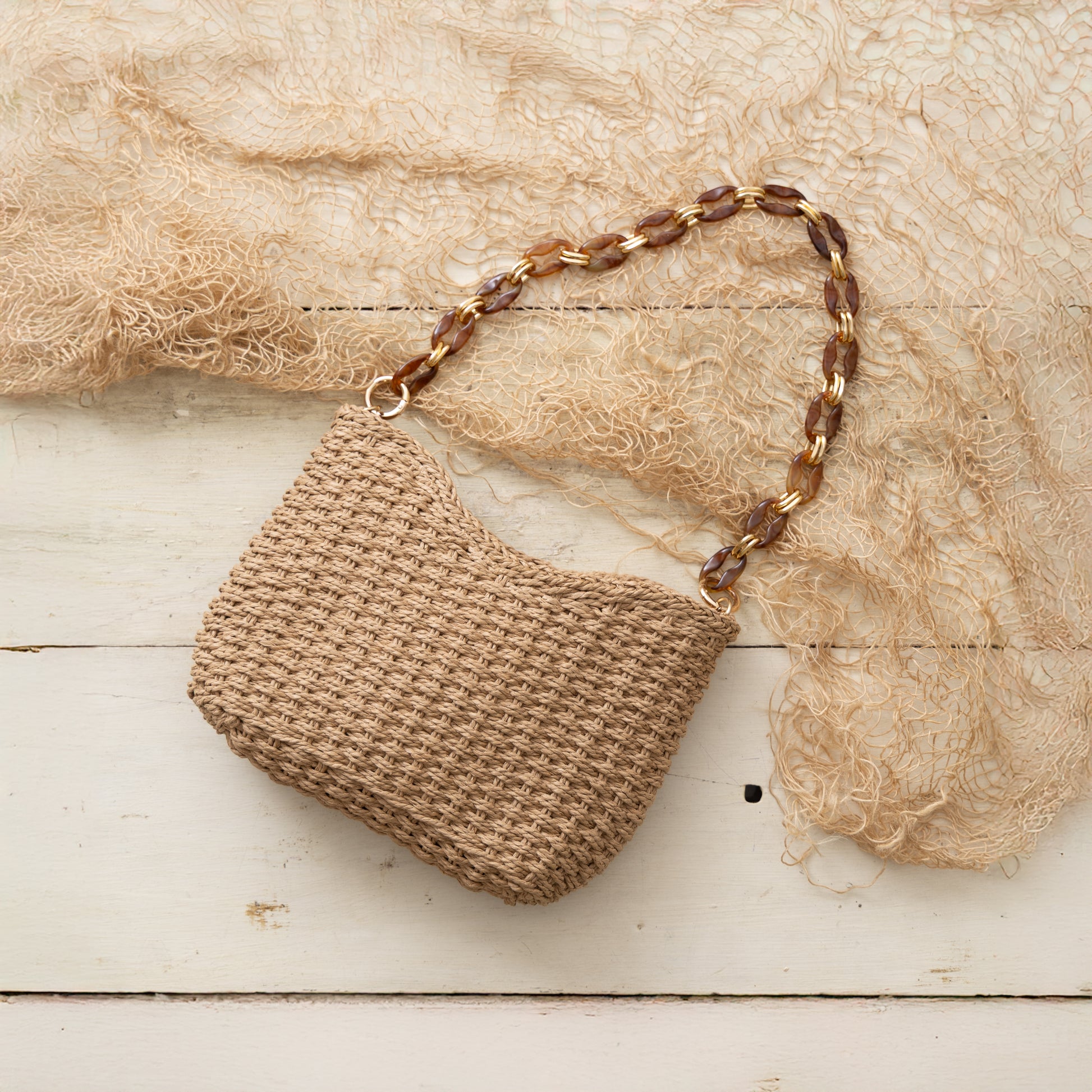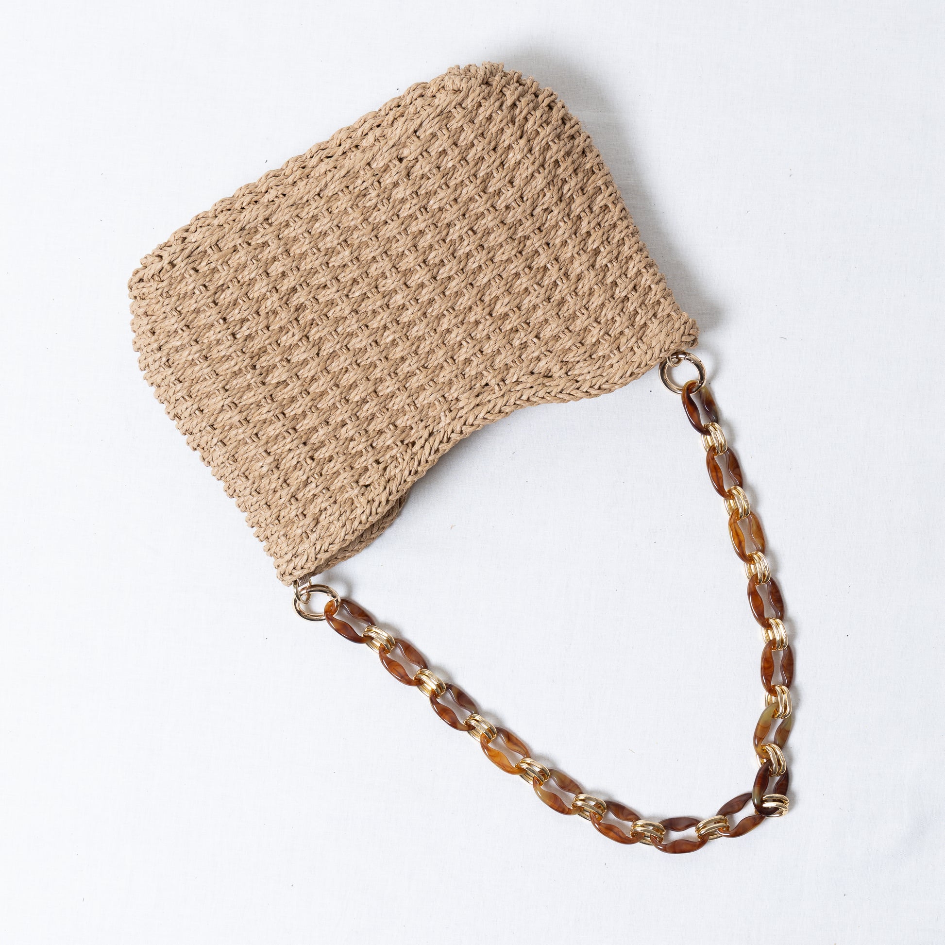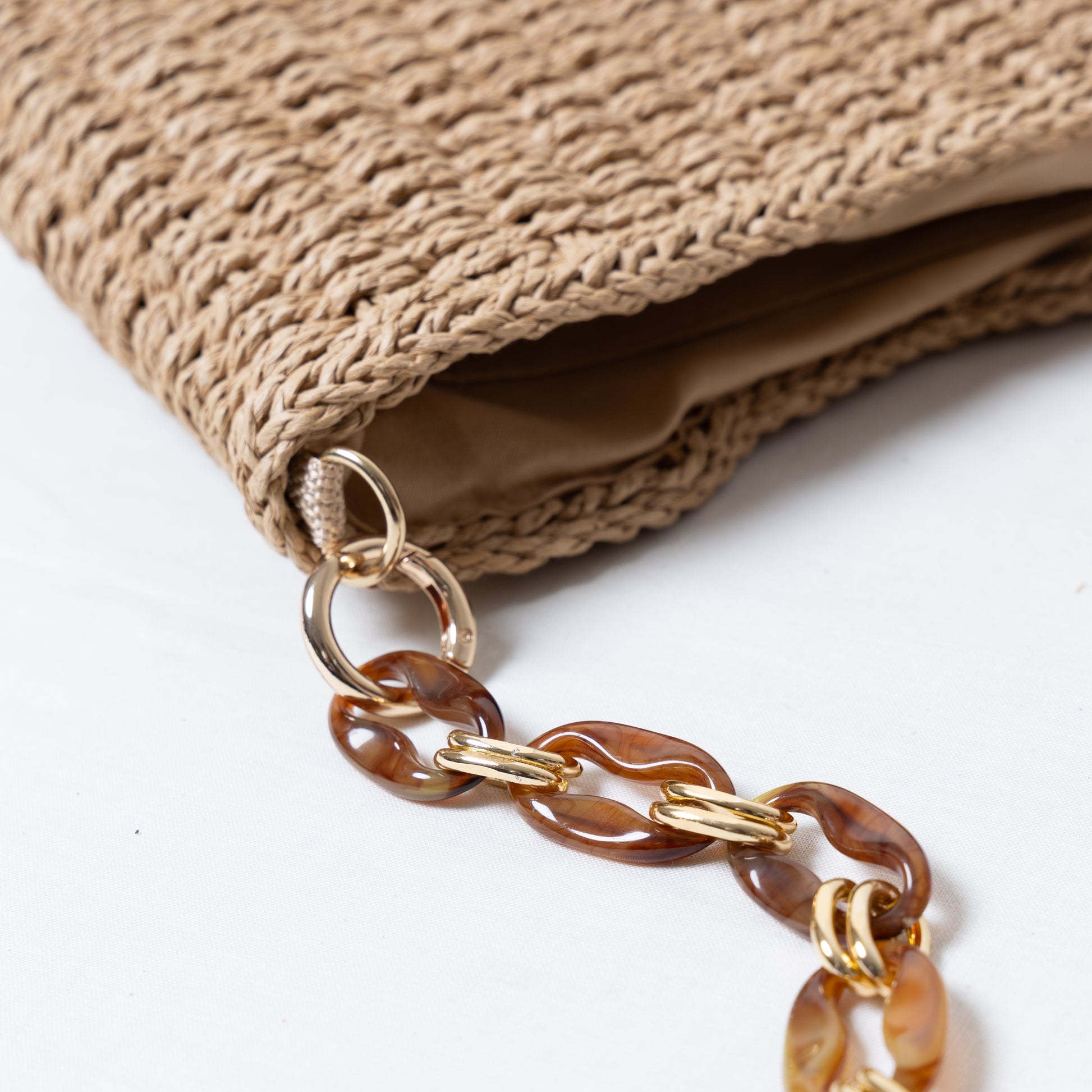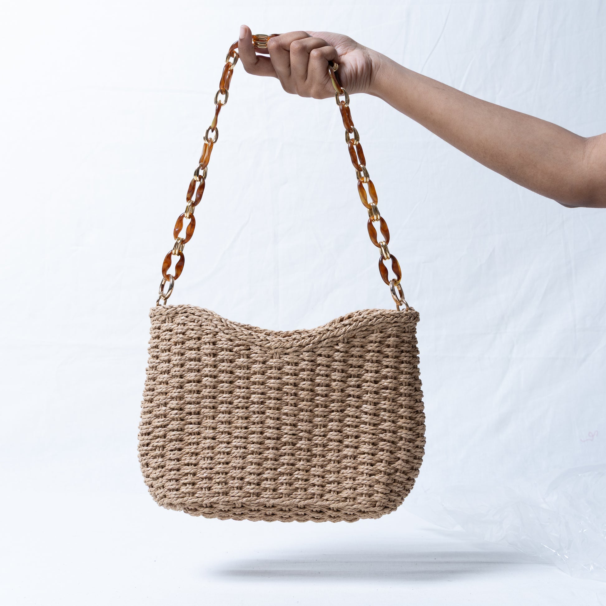 This is a handwoven bag in a natural beige tone, exuding earthy elegance. The weave is tightly structured, giving it both strength and a refined texture. Its standout feature is the handle crafted from chunky, interlinked resin chain links in warm brown and golden hues, adding a modern and chic twist to the rustic body.