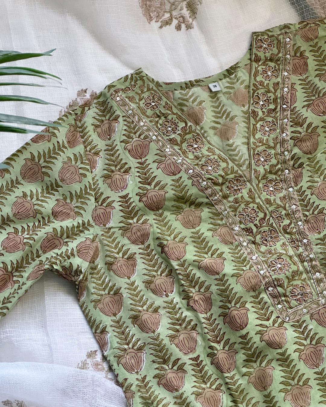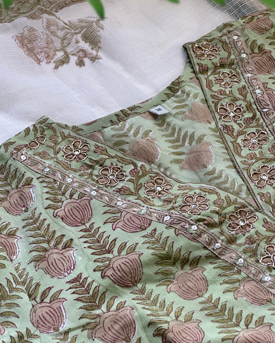 This three-piece suit set features a soft pastel green base adorned with traditional handblock floral motifs in warm earthy tones. The straight-cut kurta is beautifully highlighted with V-neckline, embellished with delicate threadwork and subtle sequin accents that add a refined sparkle.