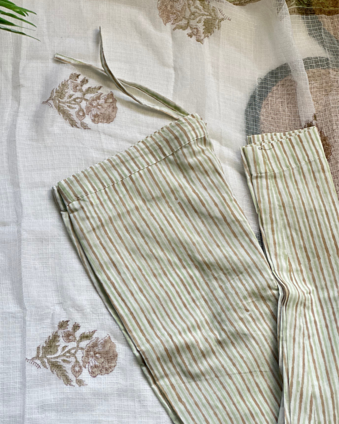 Paired with it is a coordinated striped cotton pant with a pocket, in soothing beige and green hues for effortless comfort and style. Completing the set is a premium cotton doriya dupatta with floral patterns, giving the entire ensemble a breezy, graceful finish.