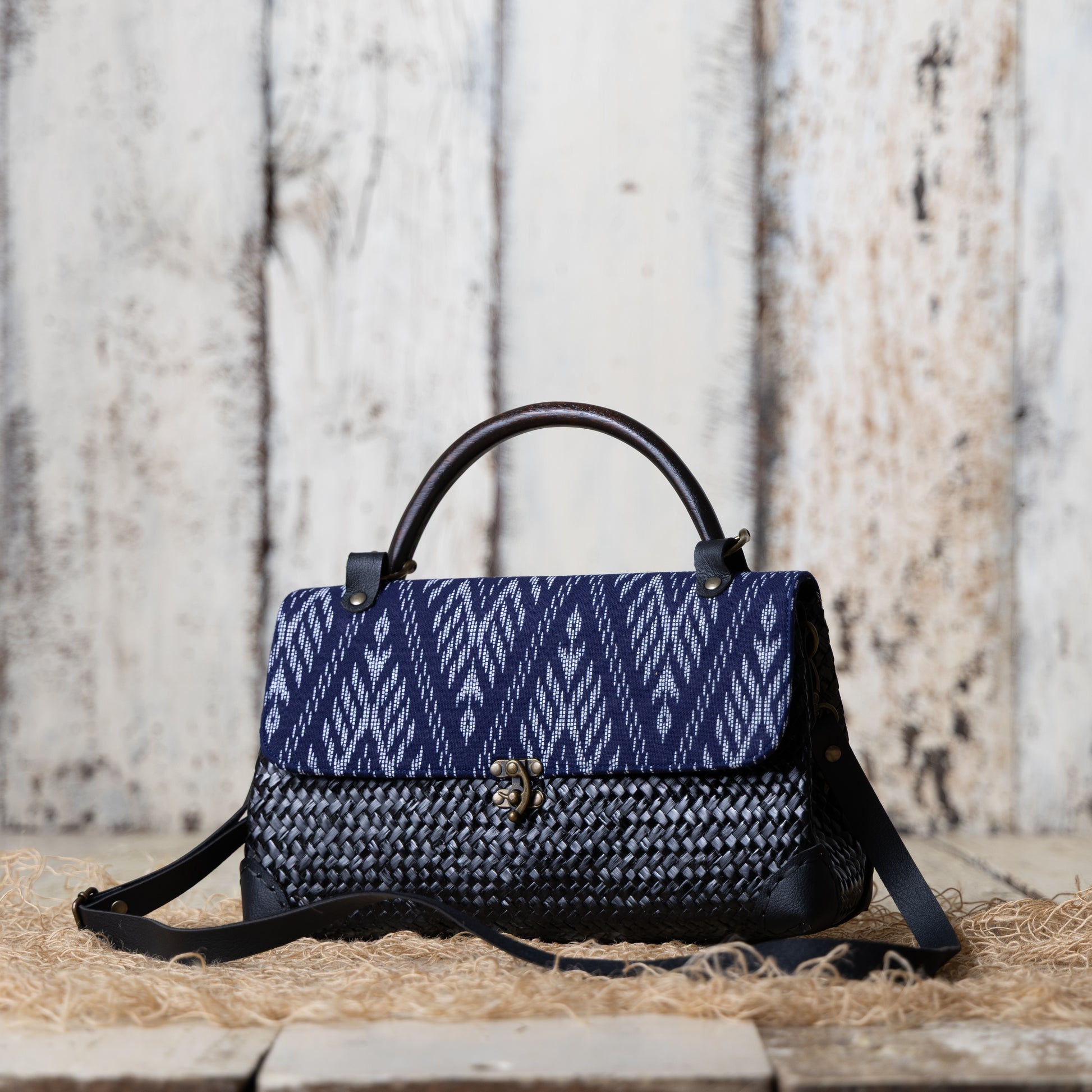 Embrace the beauty of nature with our stunning woven grass bag, accentuated by the allure of indigo fabric. The indigo fabric and the earthy tones of the grass is a mesmerizing contrast that captivates the eye.