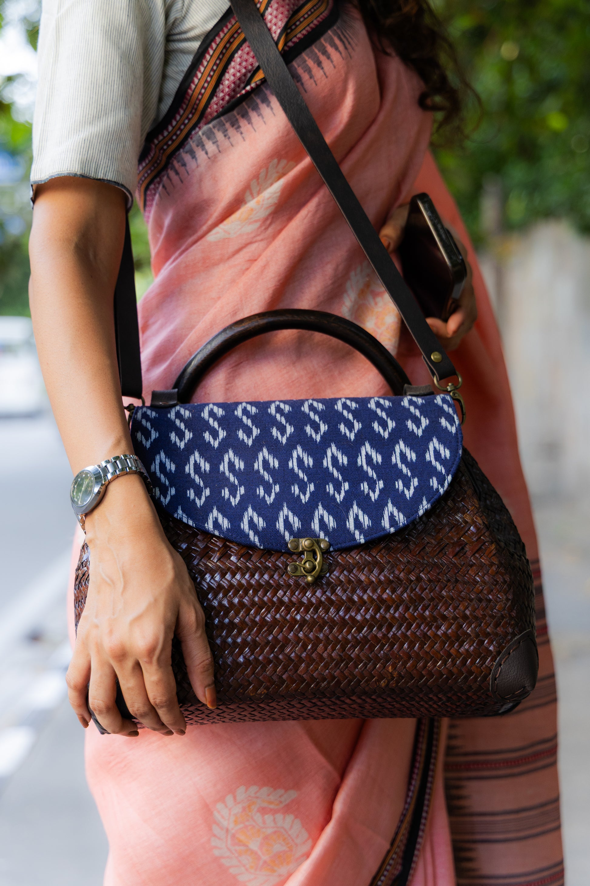 Indigo Splendor: The bag is adorned with indigo fabric, a textile artistry that has stood the test of time. The deep, rich hues of indigo bring a sense of depth and mystery, making this bag a true statement piece.