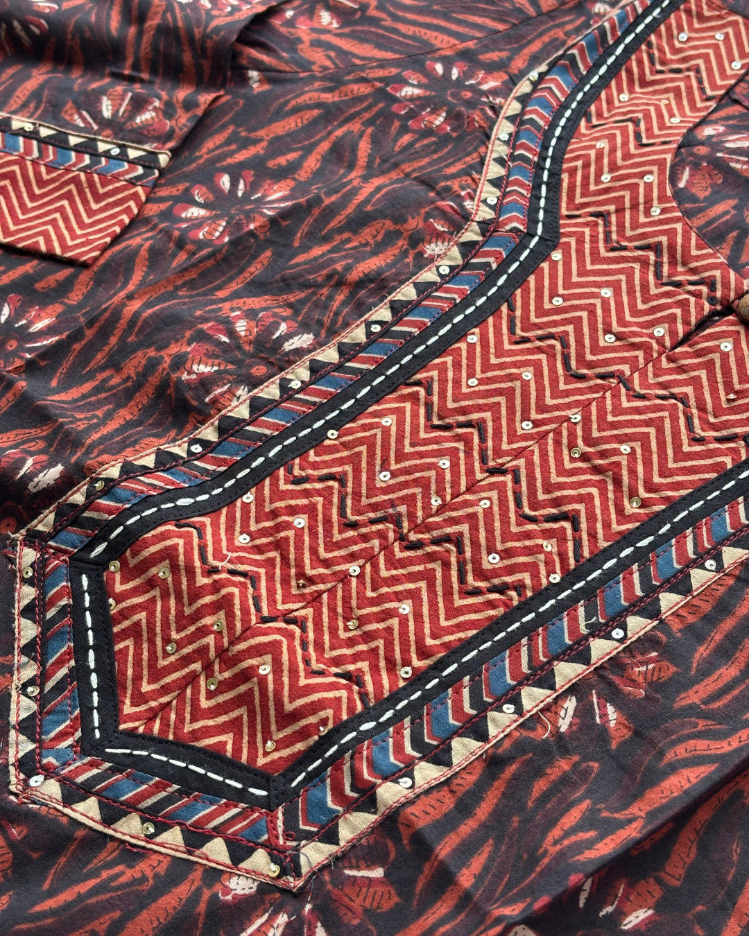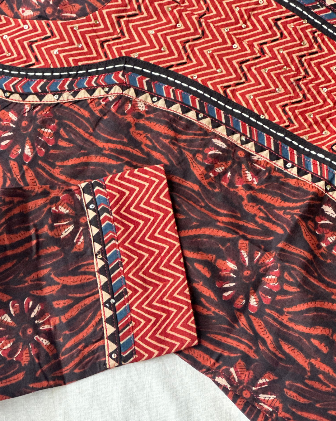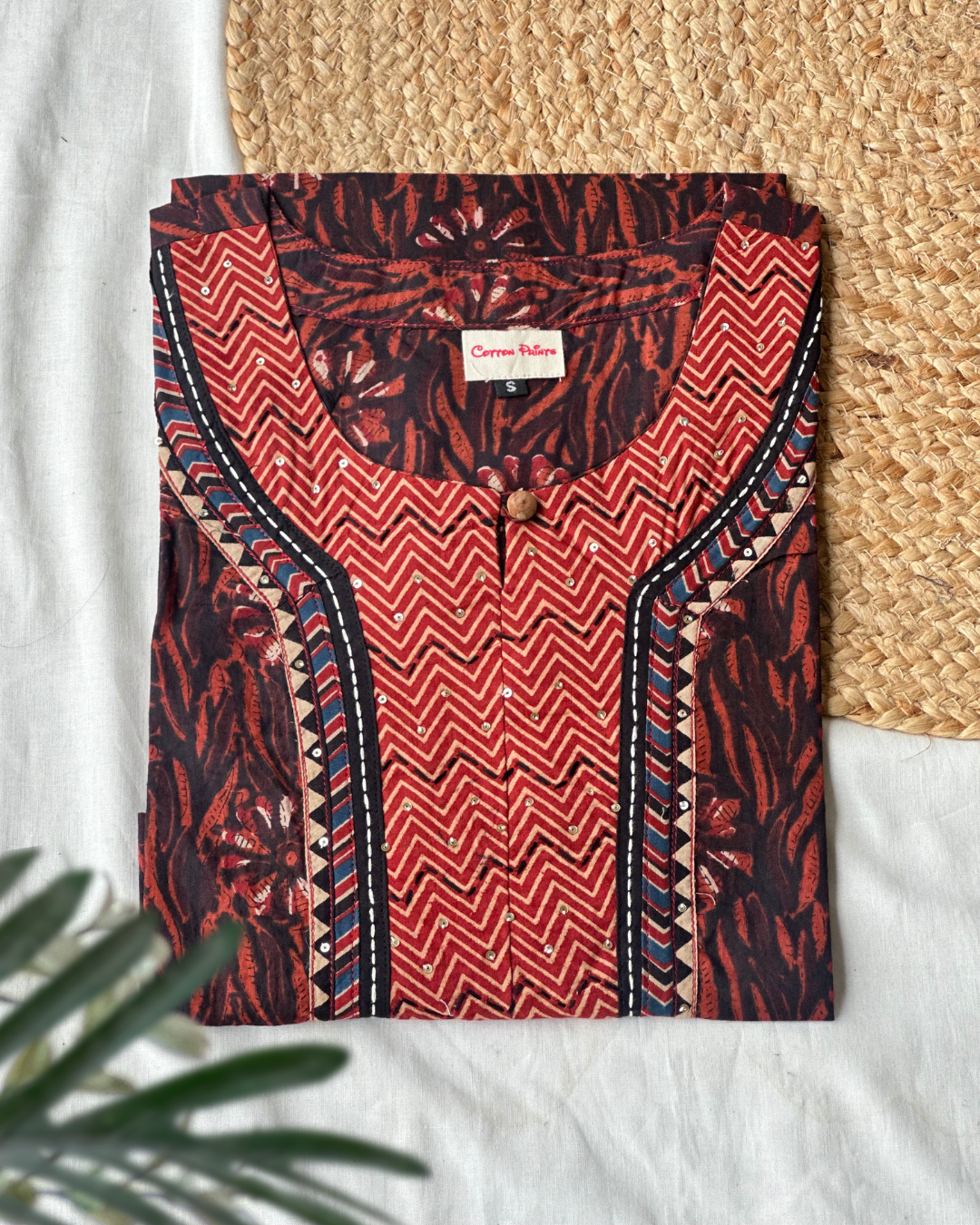 This soft cotton kurti features earthy handblock-style florals with a bold red zig-zag yoke and intricate border detailing. A comfortable, breathable piece with a beautifully crafted ethnic touch.