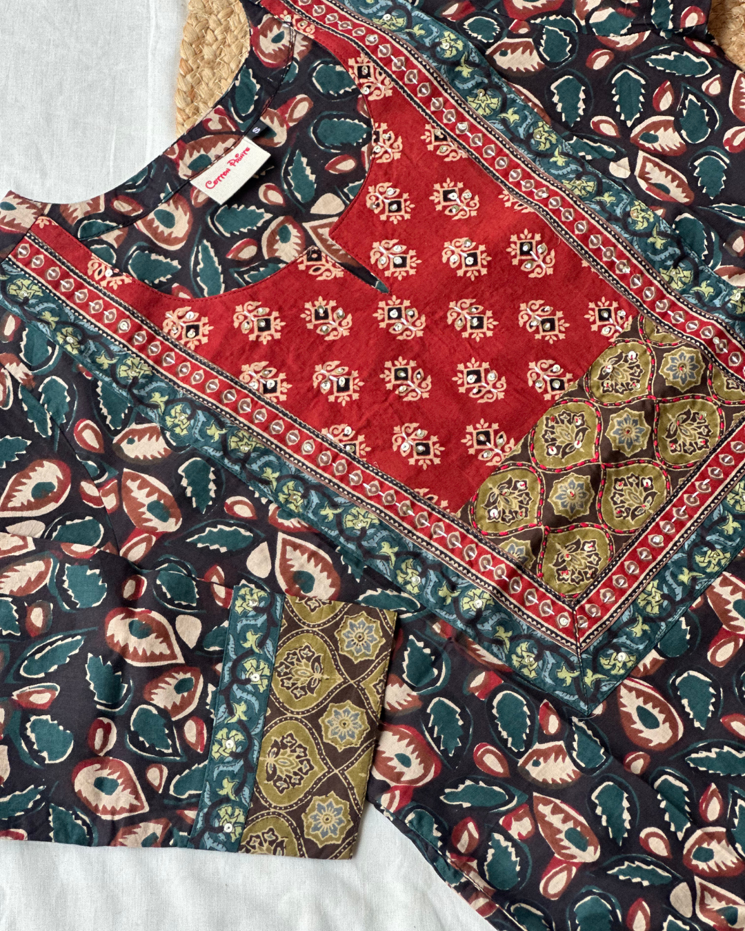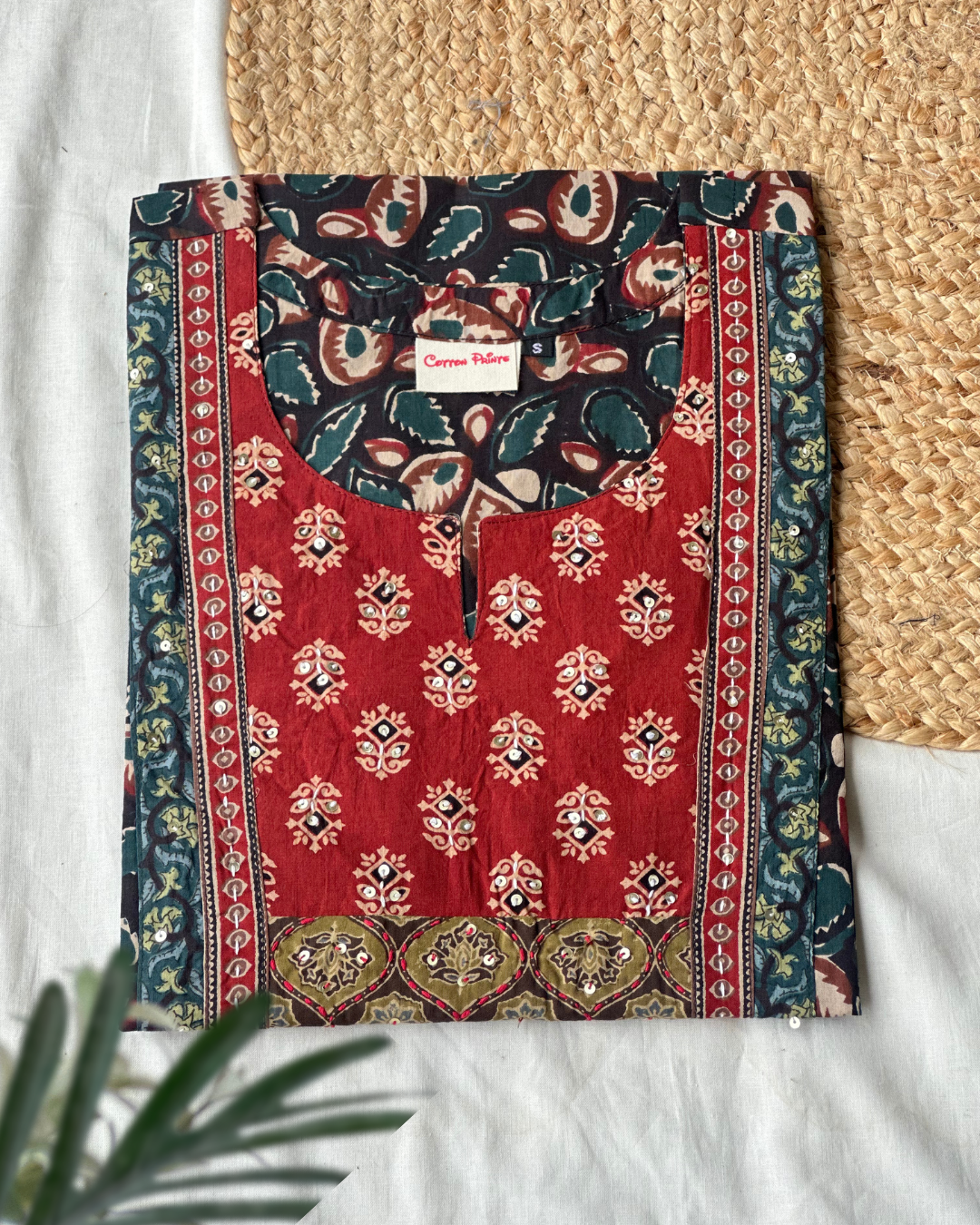 This soft cotton kurti showcases a beautiful mix of traditional prints—deep green leaf motifs paired with a rust color patterned yoke and detailed borders. The contrasting sleeve accent adds a refined handcrafted charm, making it a stylish and comfortable everyday ethnic piece.