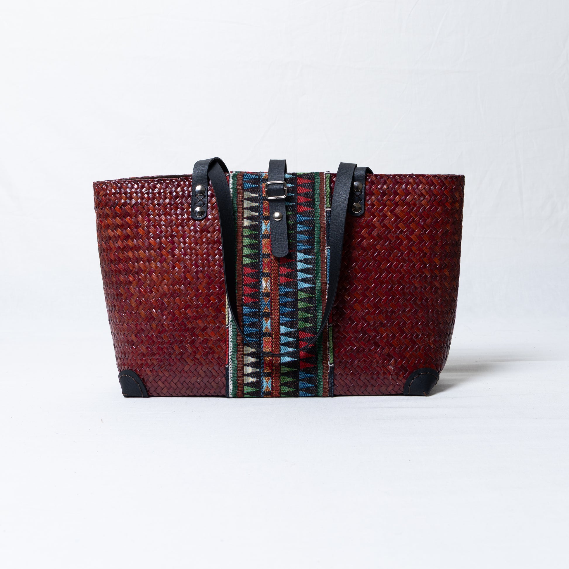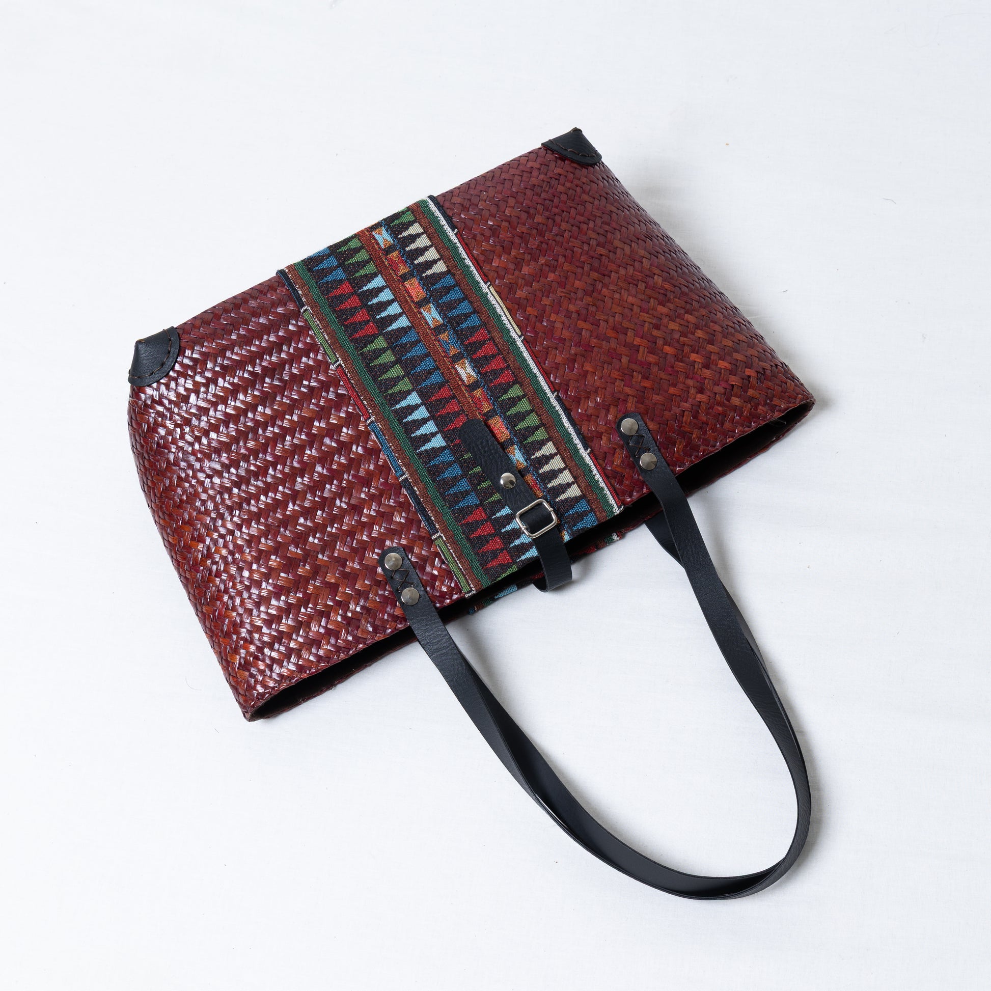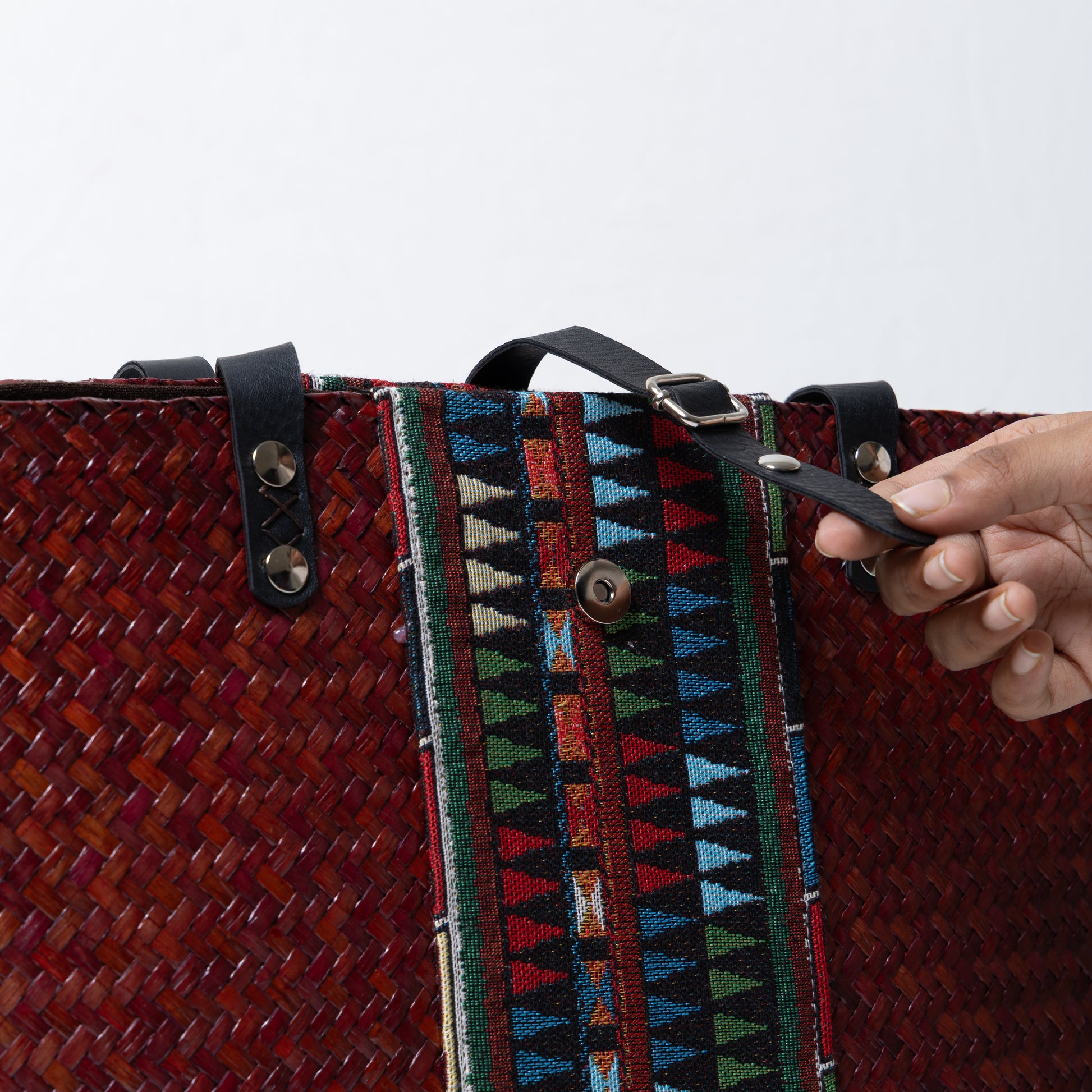 This spacious woven grassbag is all about comfort and style coming together. The rich wine-colored weave gives it a warm, earthy feel, while the front is elevated with fabric panel with geometric patterns adding an artisanal touch. Finished with sturdy black faux leather handles, it’s made to carry everything you need with ease. Whether you’re heading out for shopping, work, or just a day out, this bag is roomy, practical, and beautifully handcrafted — a piece you’ll love to use.
