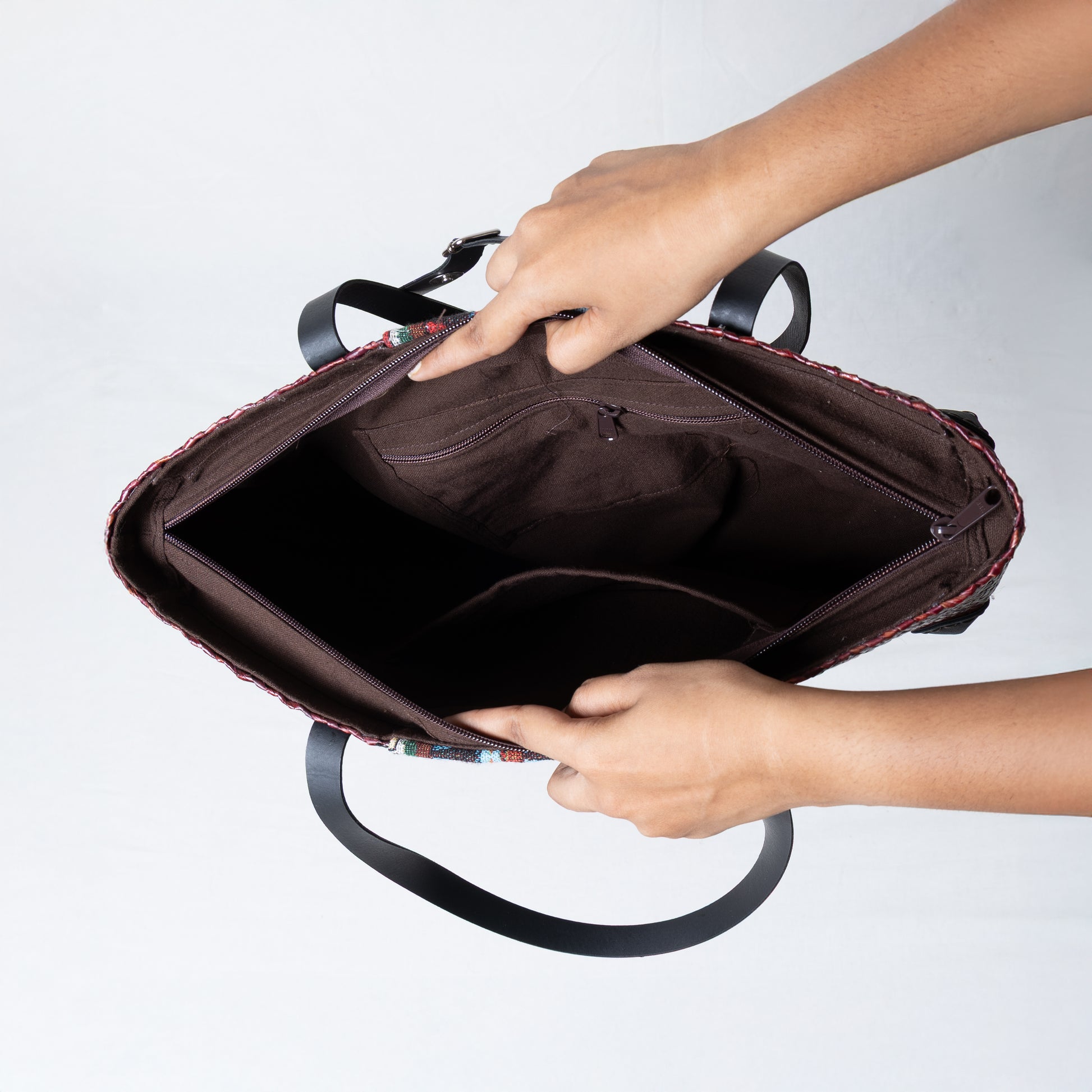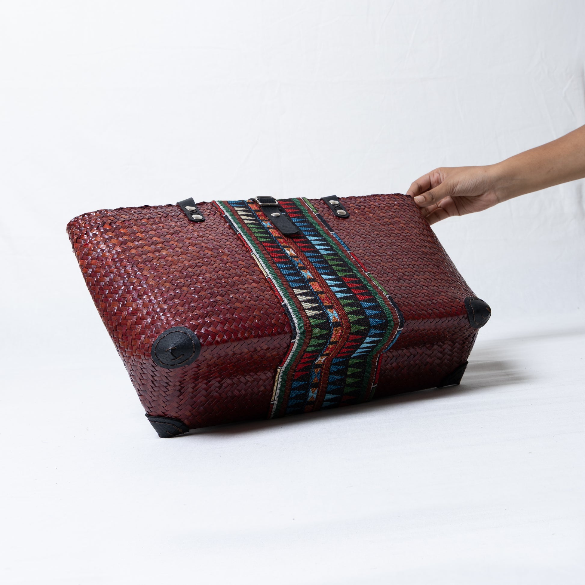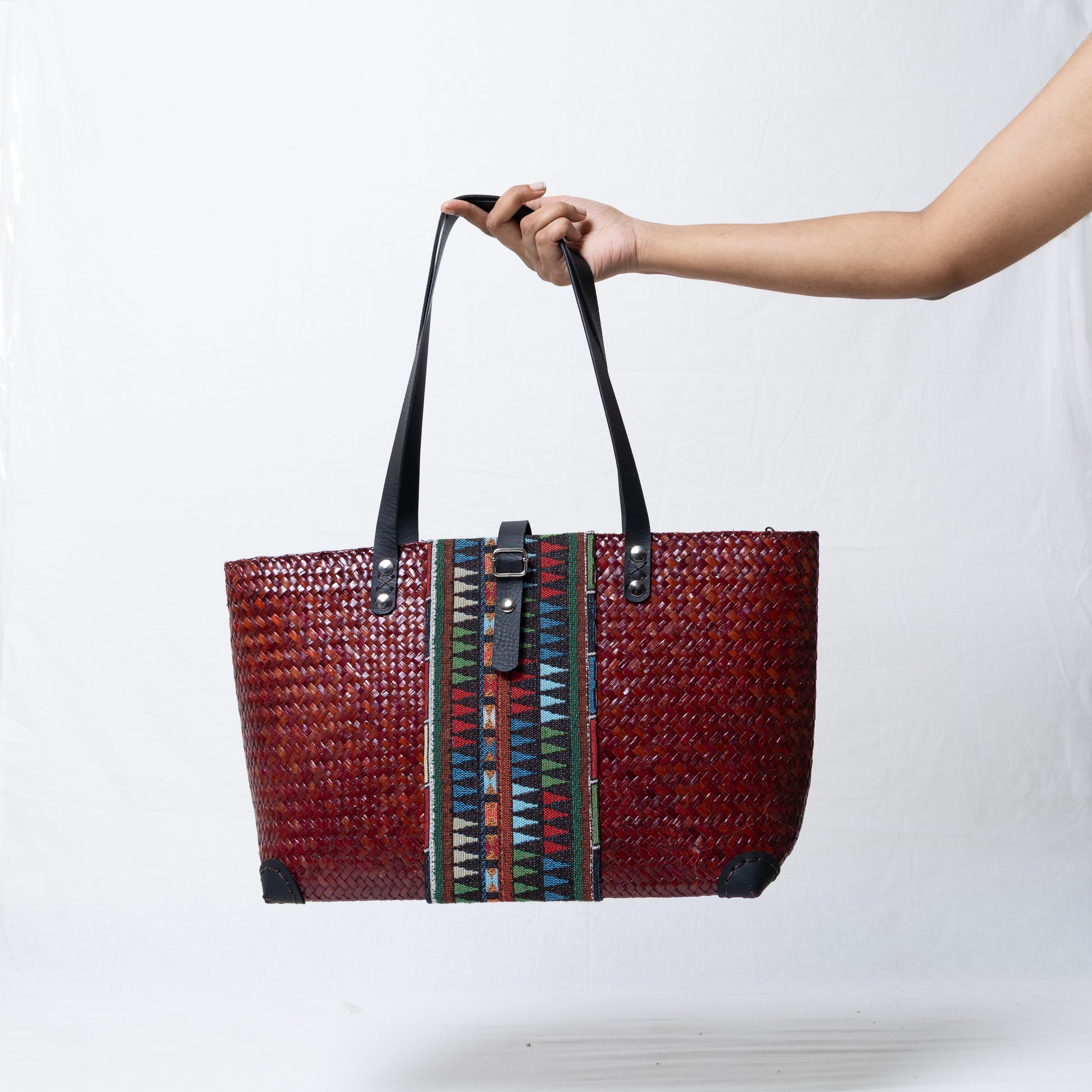 This spacious woven grassbag is all about comfort and style coming together. The rich wine-colored weave gives it a warm, earthy feel, while the front is elevated with fabric panel with geometric patterns adding an artisanal touch. Finished with sturdy black faux leather handles, it’s made to carry everything you need with ease. Whether you’re heading out for shopping, work, or just a day out, this bag is roomy, practical, and beautifully handcrafted — a piece you’ll love to use.