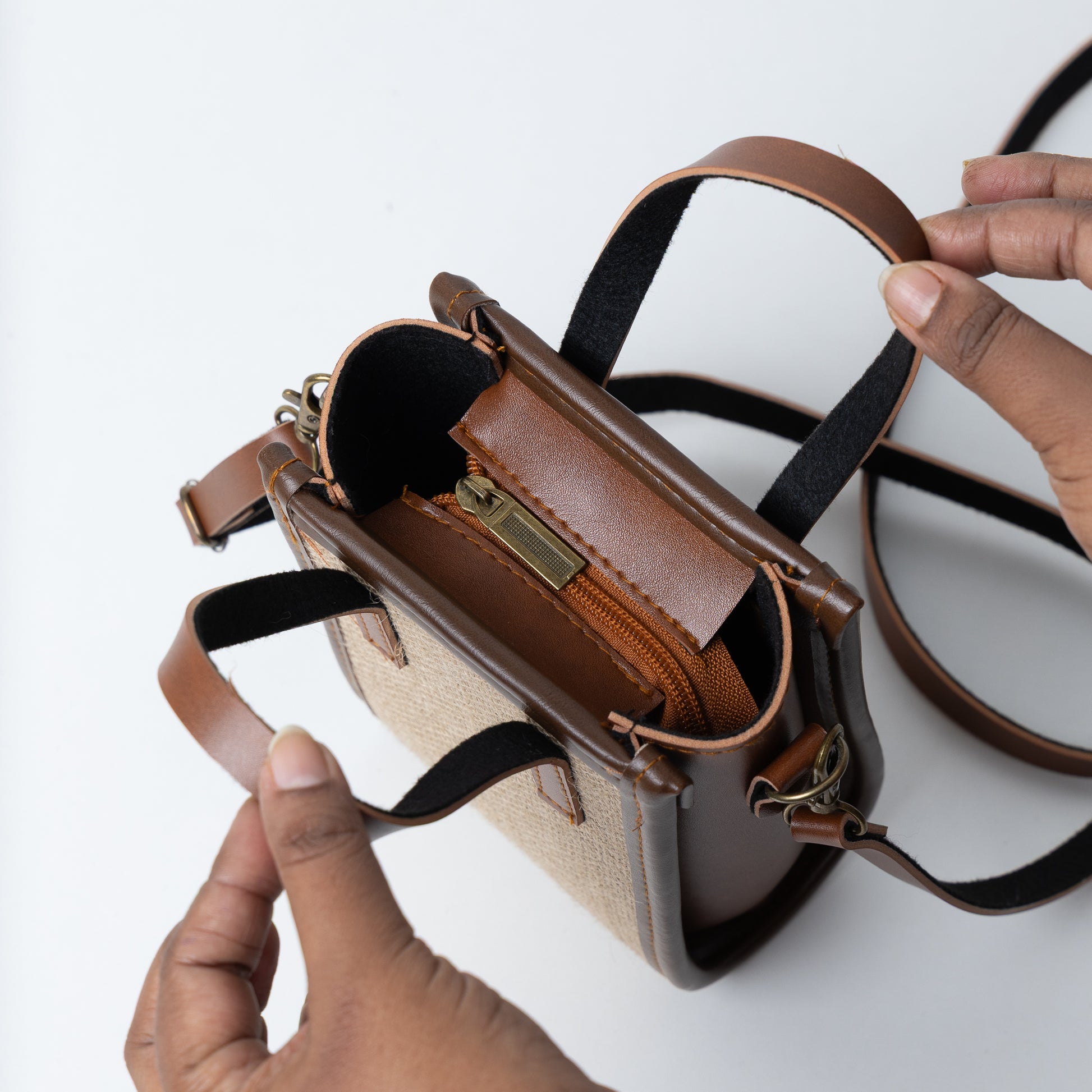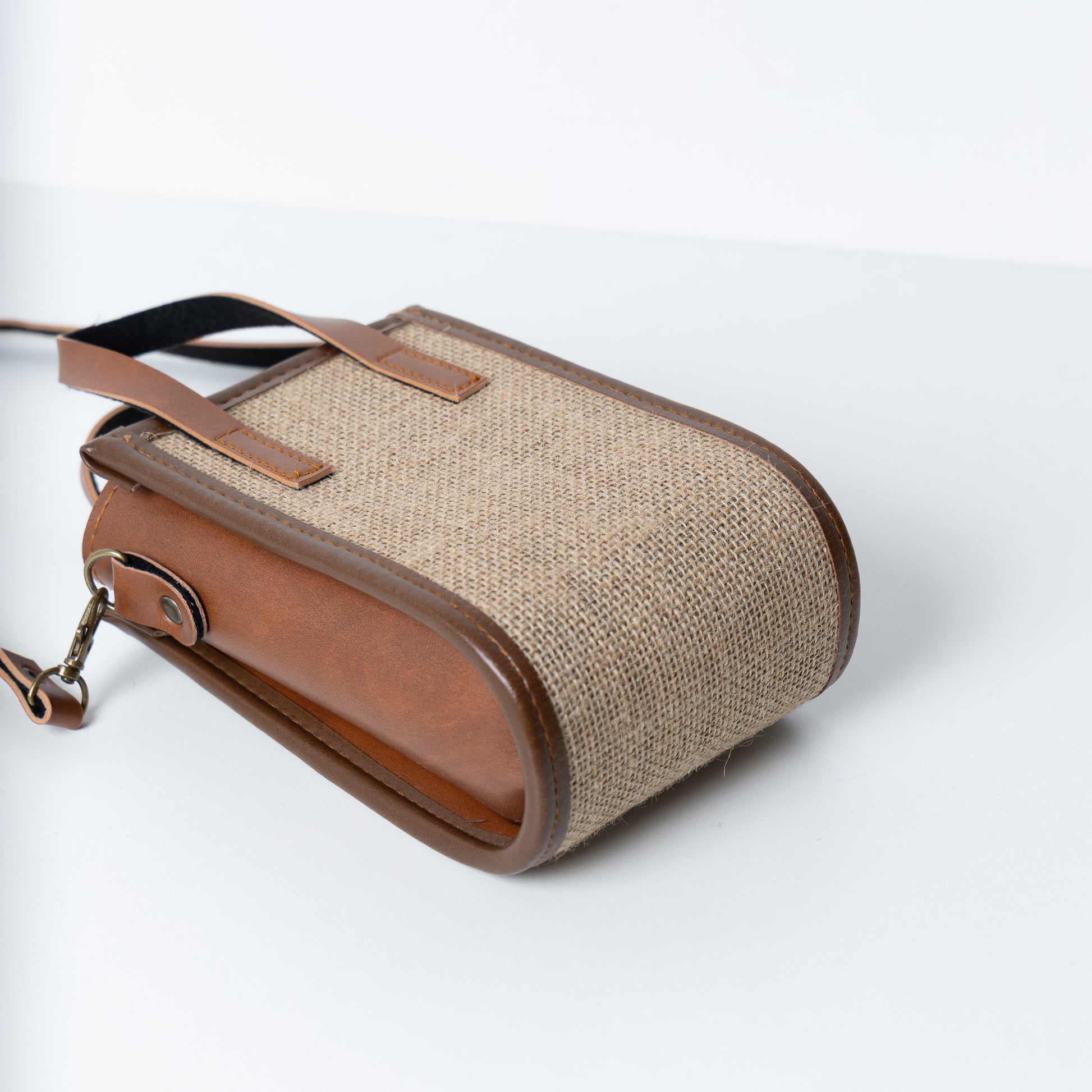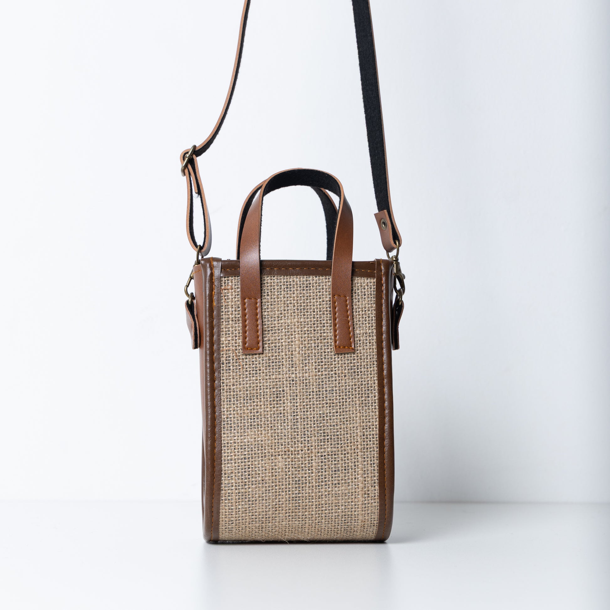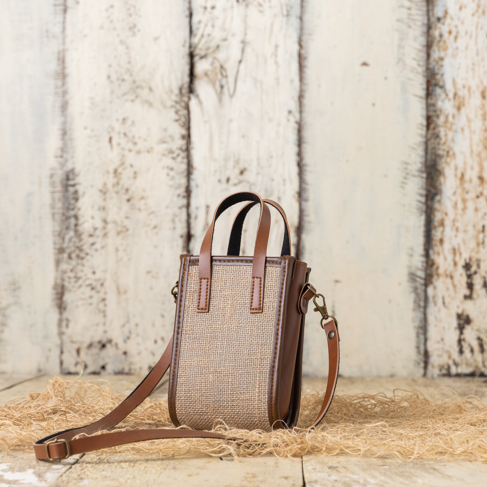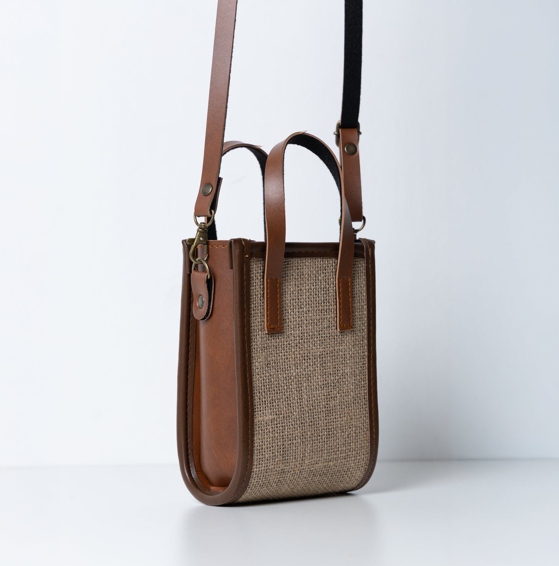 A sturdy, structured sling bag made from natural jute with classic brown faux leather detailing. Lightweight, stylish, and perfect for adding a contemporary touch to everyday looks.
