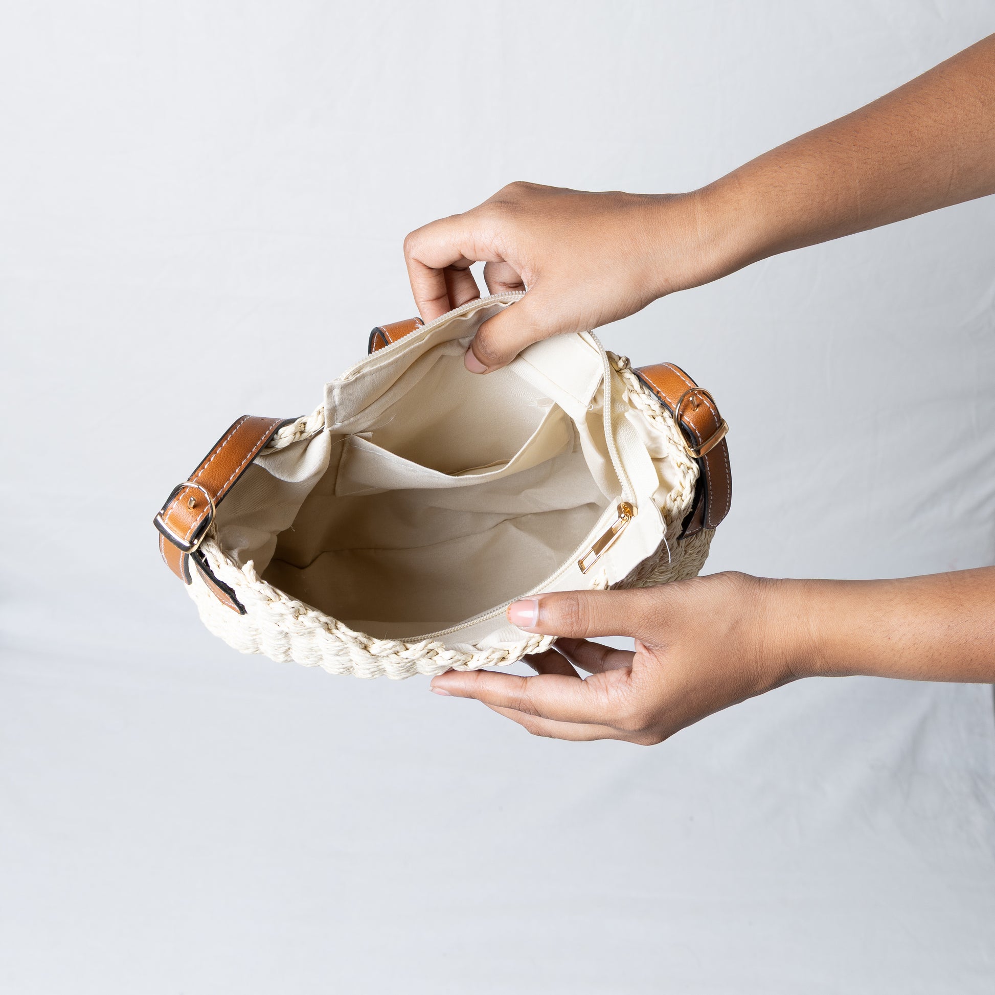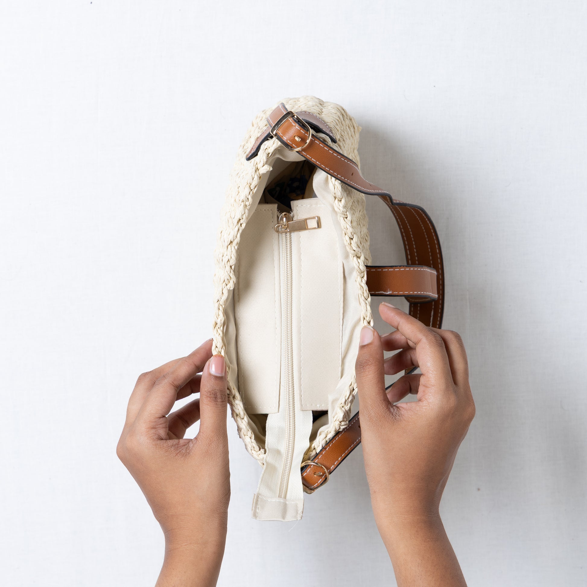 This is a chic and minimal woven sling bag crafted in a natural beige tone. The body of the bag features neat horizontal black stripes, adding a bold yet simple contrast. Its texture showcases woven artistry, giving it an earthy and organic appeal.